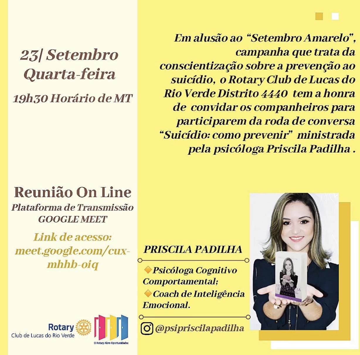 Na data de 23 de setembro de 2020, em alusão ao “Setembro Amarelo”, campanha que trata da conscientização sobre a prevenção ao suicídio, o Rotary Club de Lucas do Rio Verde Distrito 4440 realizou roda de conversa com a temática “Suicídio: como prevenir” ministrada pela psicóloga Priscila Padilha.